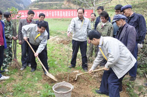 長城電工副總經(jīng)理毛建光出席栽植儀式并代表長城電工講了話,對(duì)在“雙聯(lián)”行動(dòng)中長城電工與龍壩鄉(xiāng)共同建設(shè)“千畝蘋果園基地”建設(shè)項(xiàng)目的重要意義做了進(jìn)一步的闡述,同時(shí)對(duì)當(dāng)期果苗的栽植、后期果園的管理等方面分別提出了意見與建議。