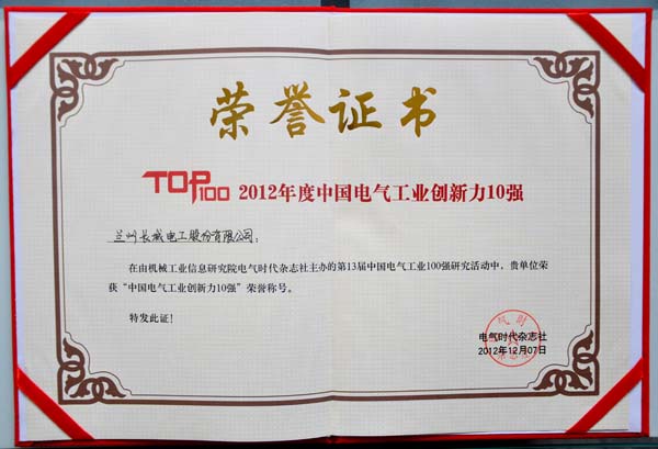2012年12月7日,2012年12月7日,在由中國機(jī)械工業(yè)聯(lián)合會主管,國內(nèi)具有重要影響的機(jī)械工業(yè)信息研究院主辦《電氣時(shí)代》雜志社舉辦的“第九屆中國電氣工業(yè)發(fā)展高峰論壇暨第13屆中國電氣工業(yè)100強(qiáng)研究發(fā)布會”頒獎(jiǎng)大會上,蘭州長城電工股份有限公司榮獲“第十二屆中國電氣工業(yè)100強(qiáng)”(2011年度)和“中國電氣工業(yè)創(chuàng)新力10強(qiáng)”榮譽(yù)稱號,位列中國電氣工業(yè)100強(qiáng)第54位,并被評選表彰為中國電氣工業(yè)創(chuàng)新力10強(qiáng),這已是長城電工連續(xù)五次入選中國電氣工業(yè)100強(qiáng)。