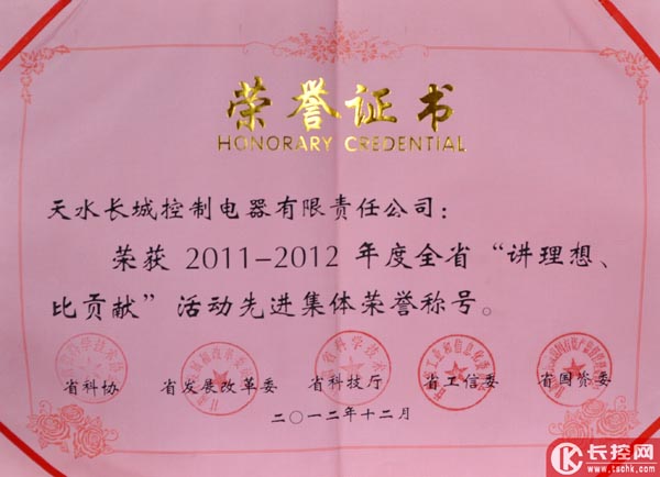 11月23日,長(zhǎng)城電工天水長(zhǎng)城控制電器有限責(zé)任公司在2011-2012年度全國(guó)“講理想、比貢獻(xiàn)”活動(dòng)中獲先進(jìn)集體榮譽(yù)稱(chēng)號(hào),受到中國(guó)科協(xié)、國(guó)家發(fā)展改革委、科技部、國(guó)務(wù)院國(guó)資委聯(lián)合表彰。