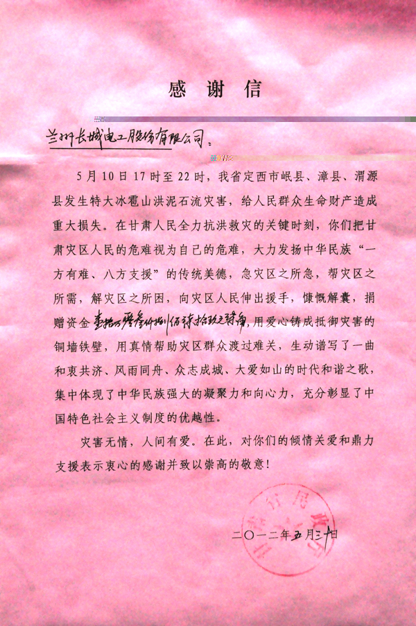5月30日,省民政廳給公司發(fā)來感謝信,對長城電工和長城電工系統(tǒng)廣大黨員職工的傾情關(guān)愛和鼎力支援表示衷心的感謝!