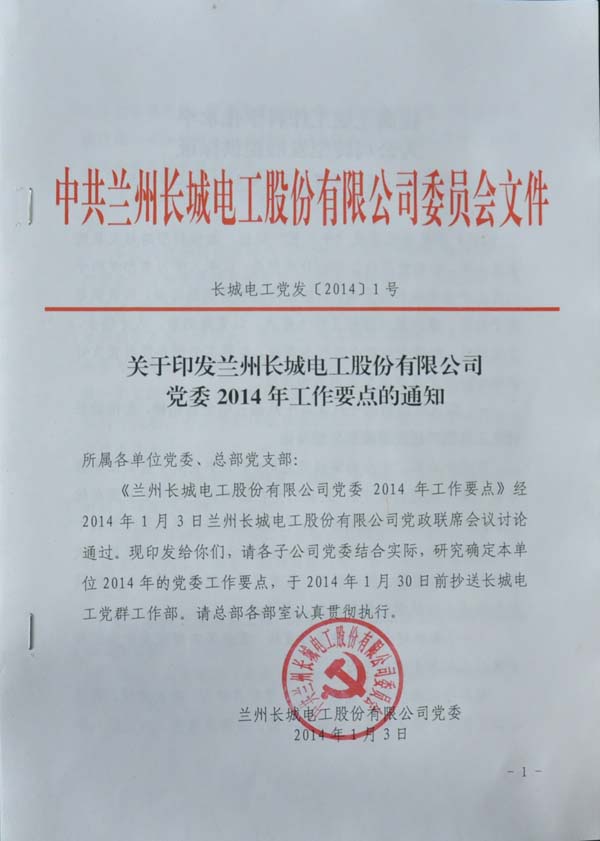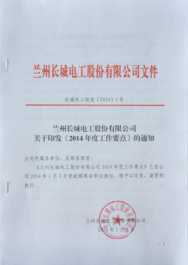 1月3日,公司黨委和行政分別下發(fā)《關(guān)于印發(fā)蘭州長城電工股份有限公司黨委2014年工作要點(diǎn)的通知》(長城電工黨發(fā)〔2014〕1號)和《蘭州長城電工股份有限公司關(guān)于印發(fā)<2014年度工作要點(diǎn)>的通知》(長城電工綜發(fā)〔2014〕1號),對公司2014年度黨委和行政工作進(jìn)行了安排部署。